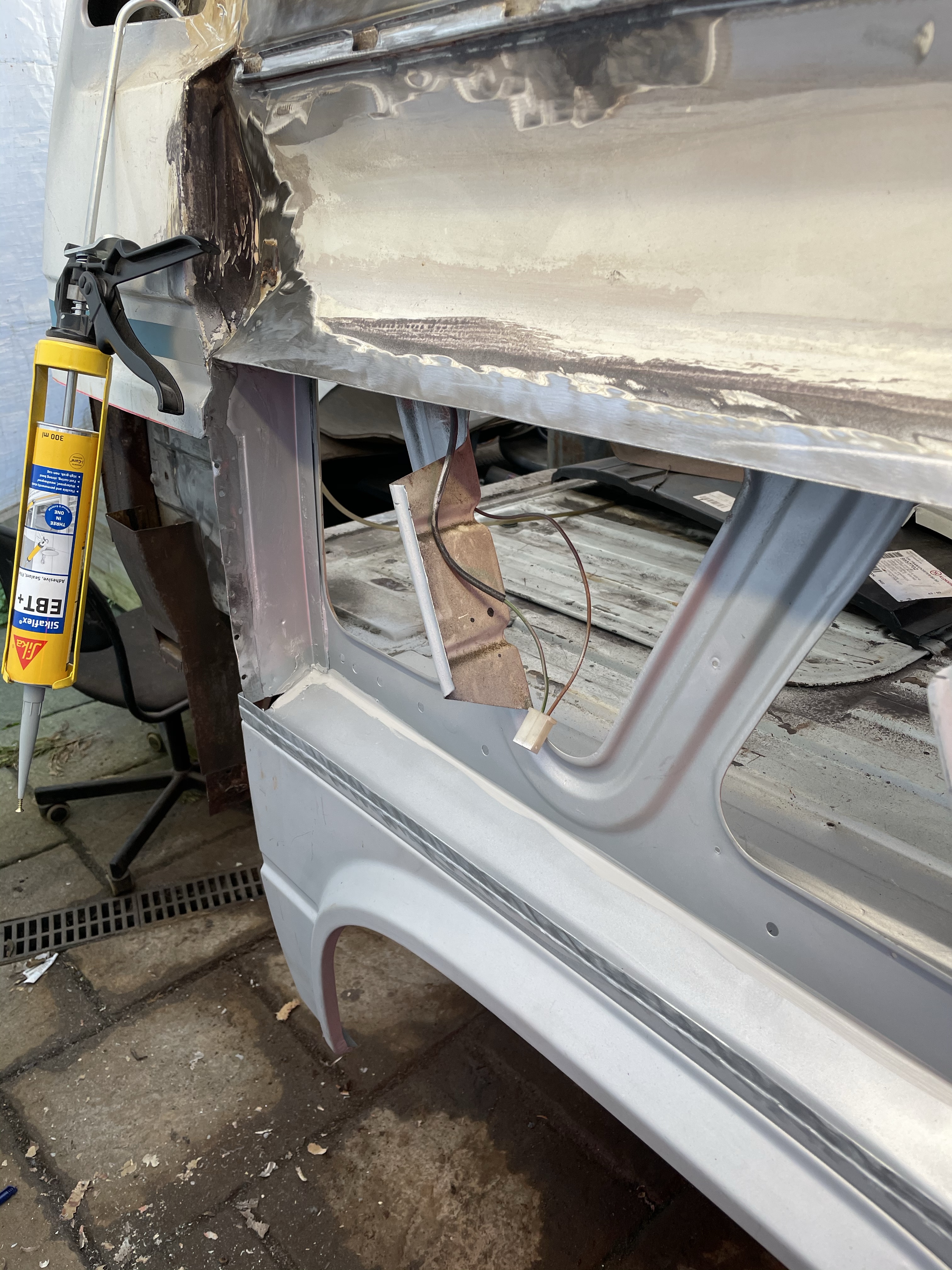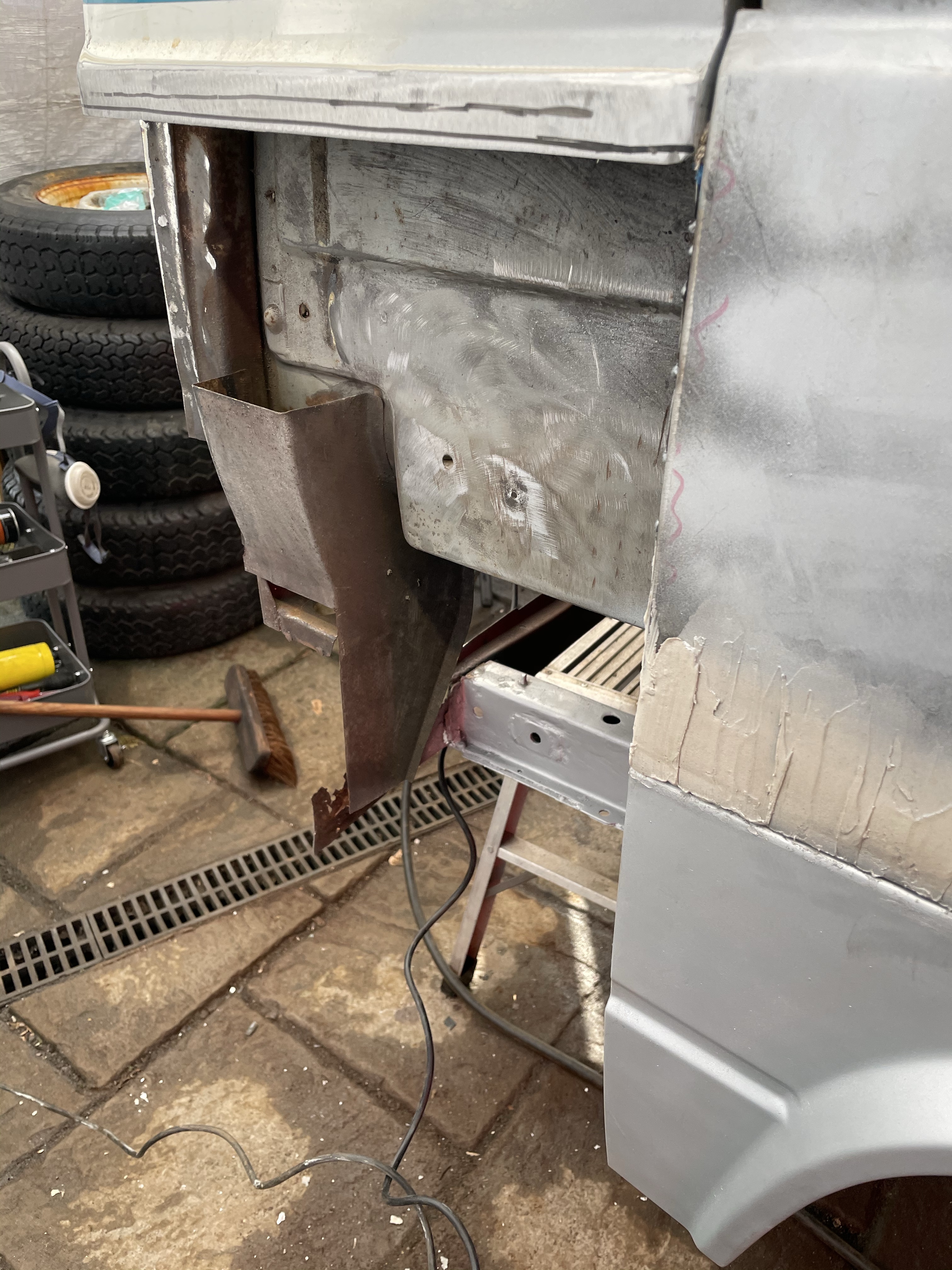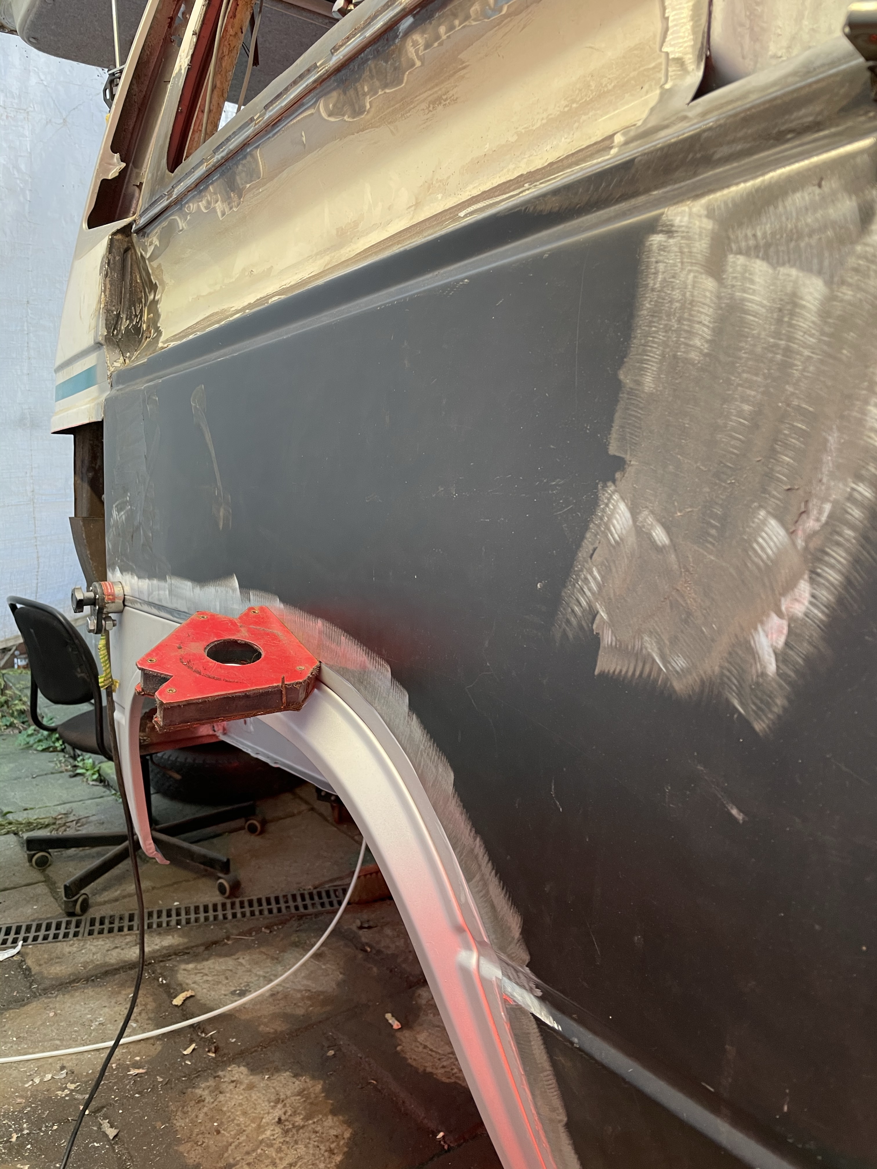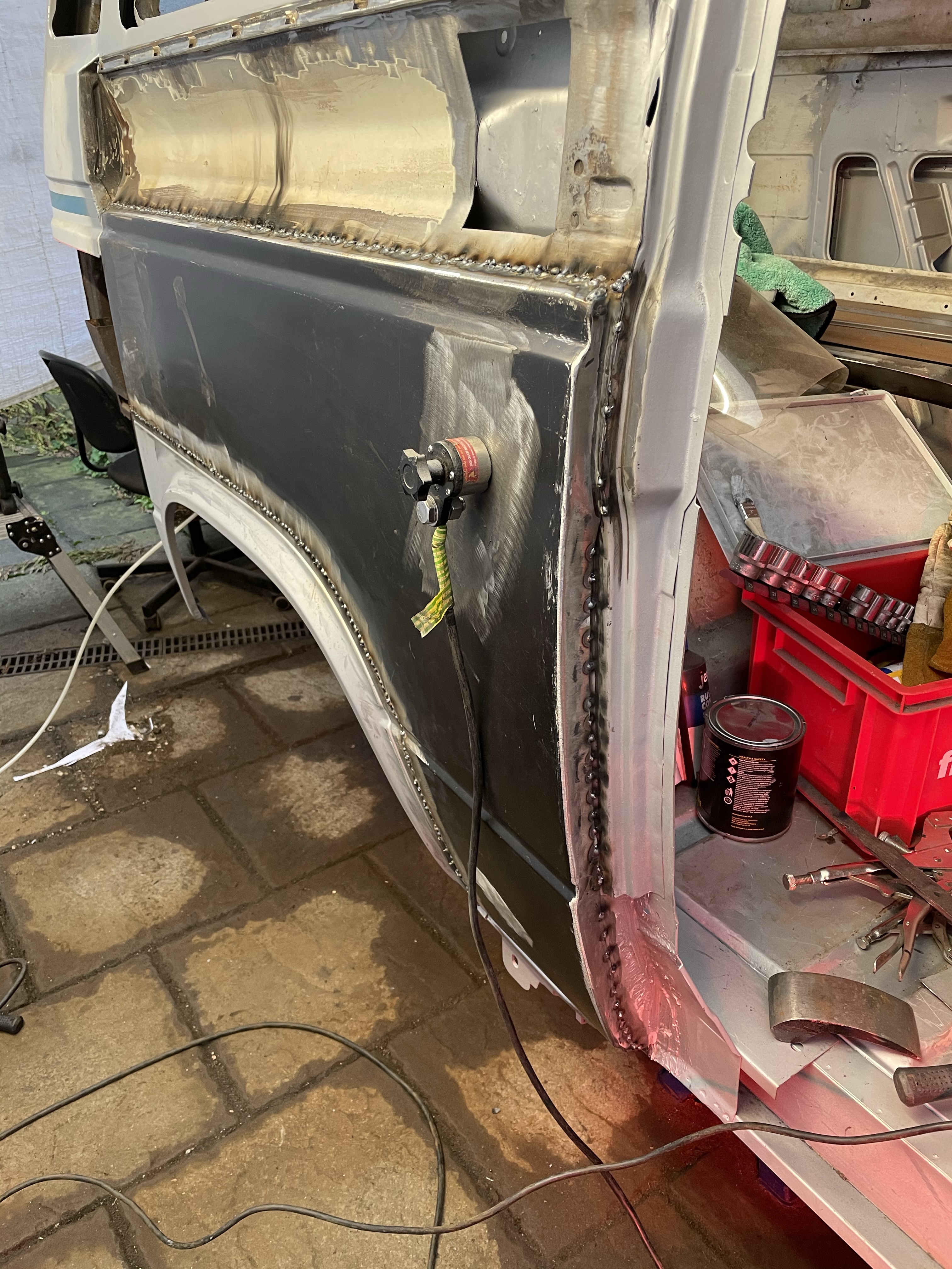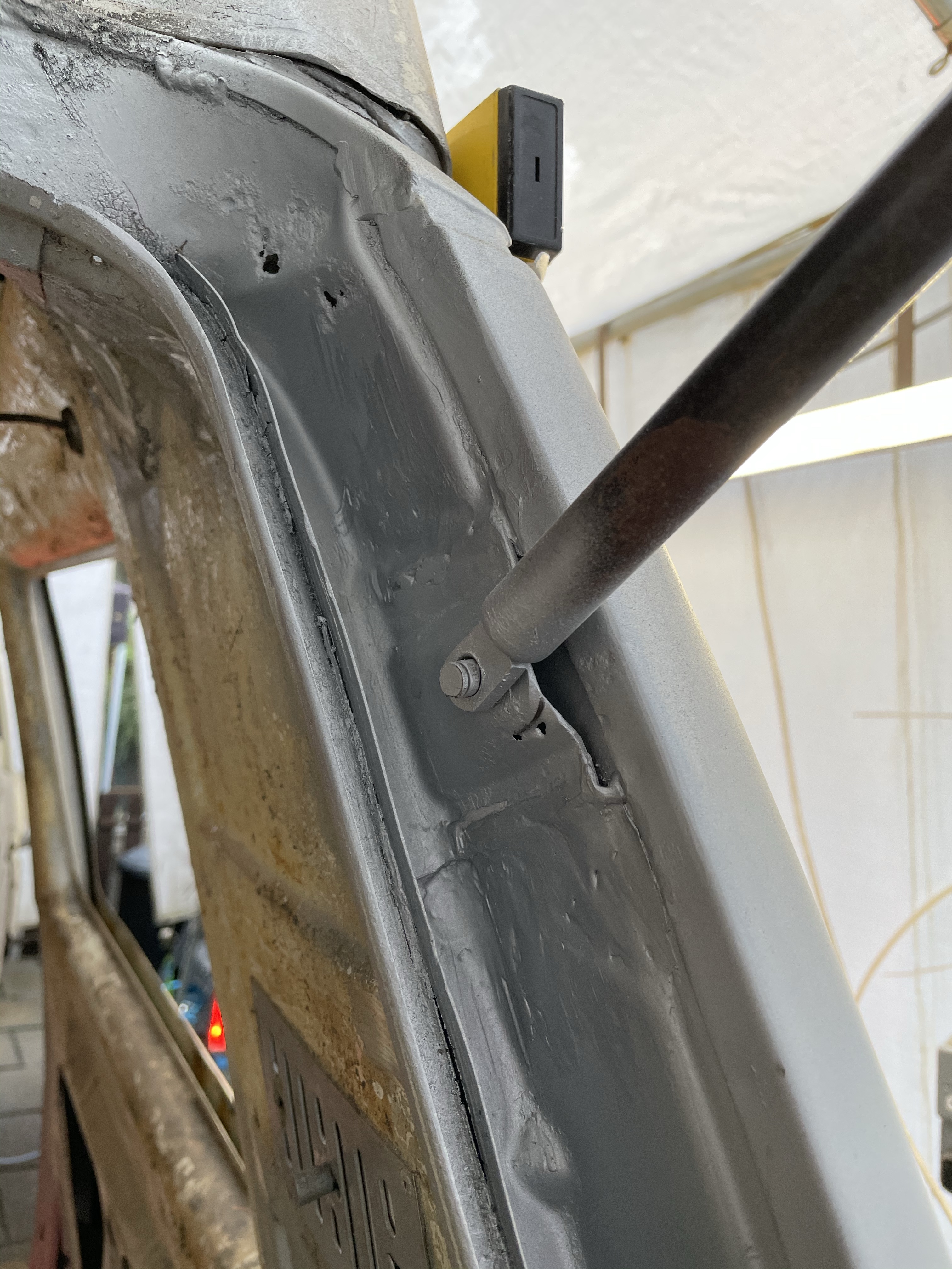One of the first things that i noticed when i bought the van was the condition of the strut mounts on the tailgate, i could tell they were corroded but the way they are set in and the amount of filler and paint etc.. i wasn’t sure how much of it was rust / rot and how much was just the weird positioning of the brackets, so after stripping it all back and cutting out the rot i did a bit of research and lots of looking at other vans it was time i tackled mine, i found a few other suspect looking holes up towards the roof line that will get sanded back and inspected before i weld those up too. Tailgate is finally solid again in its opening and closing action and sits correct on the shut lines, also i am not worried it fall off when i open it anymore.