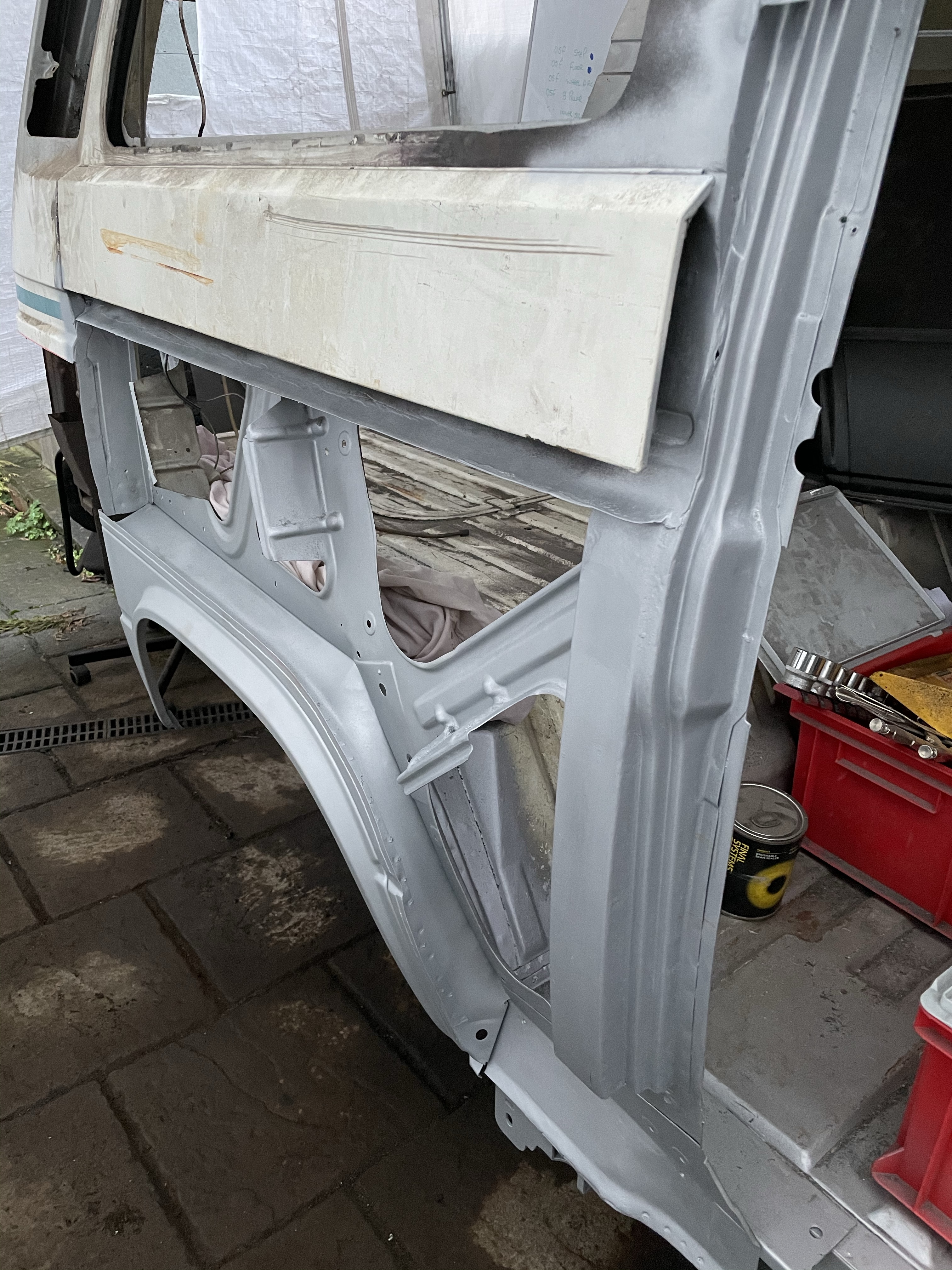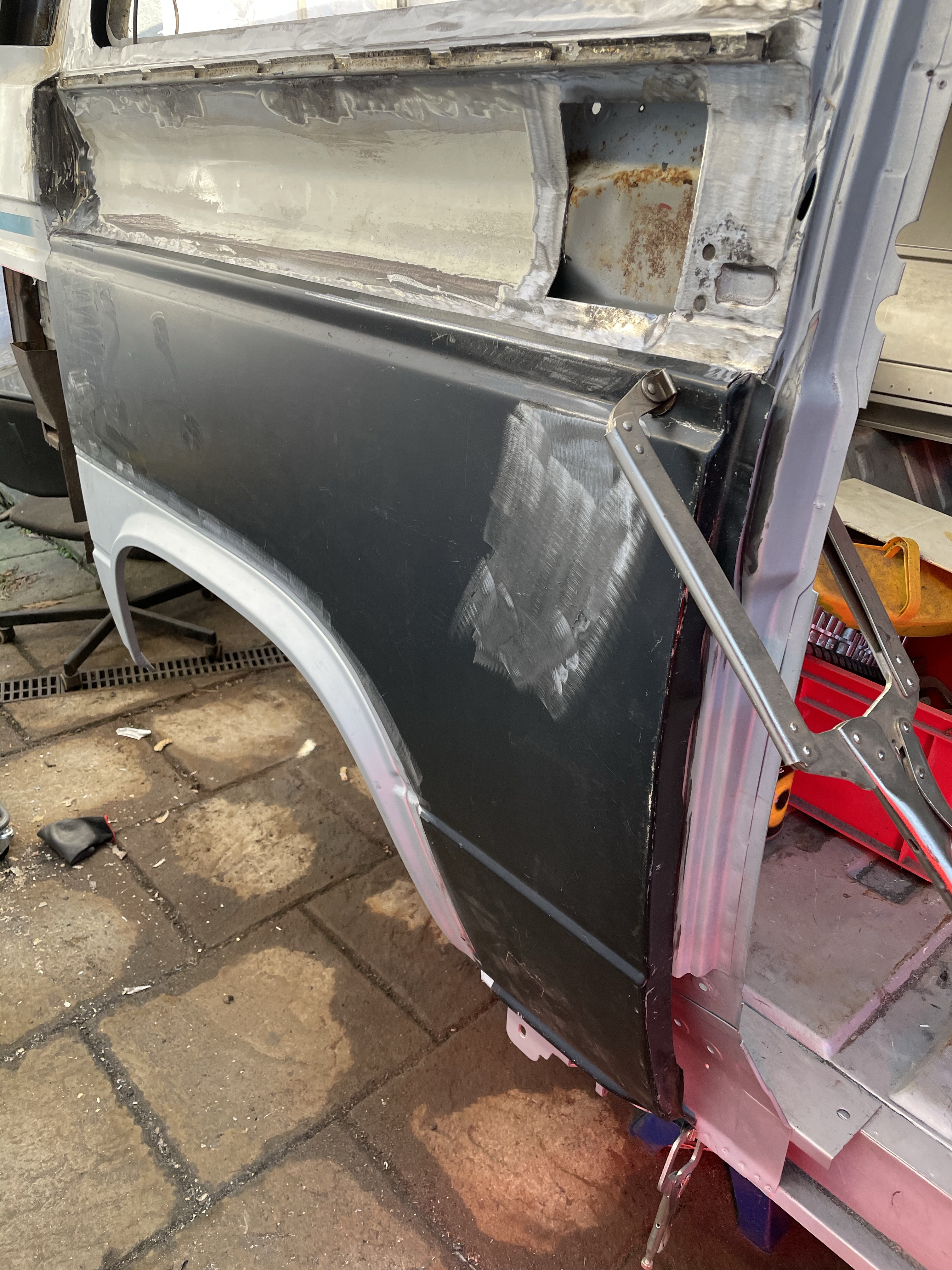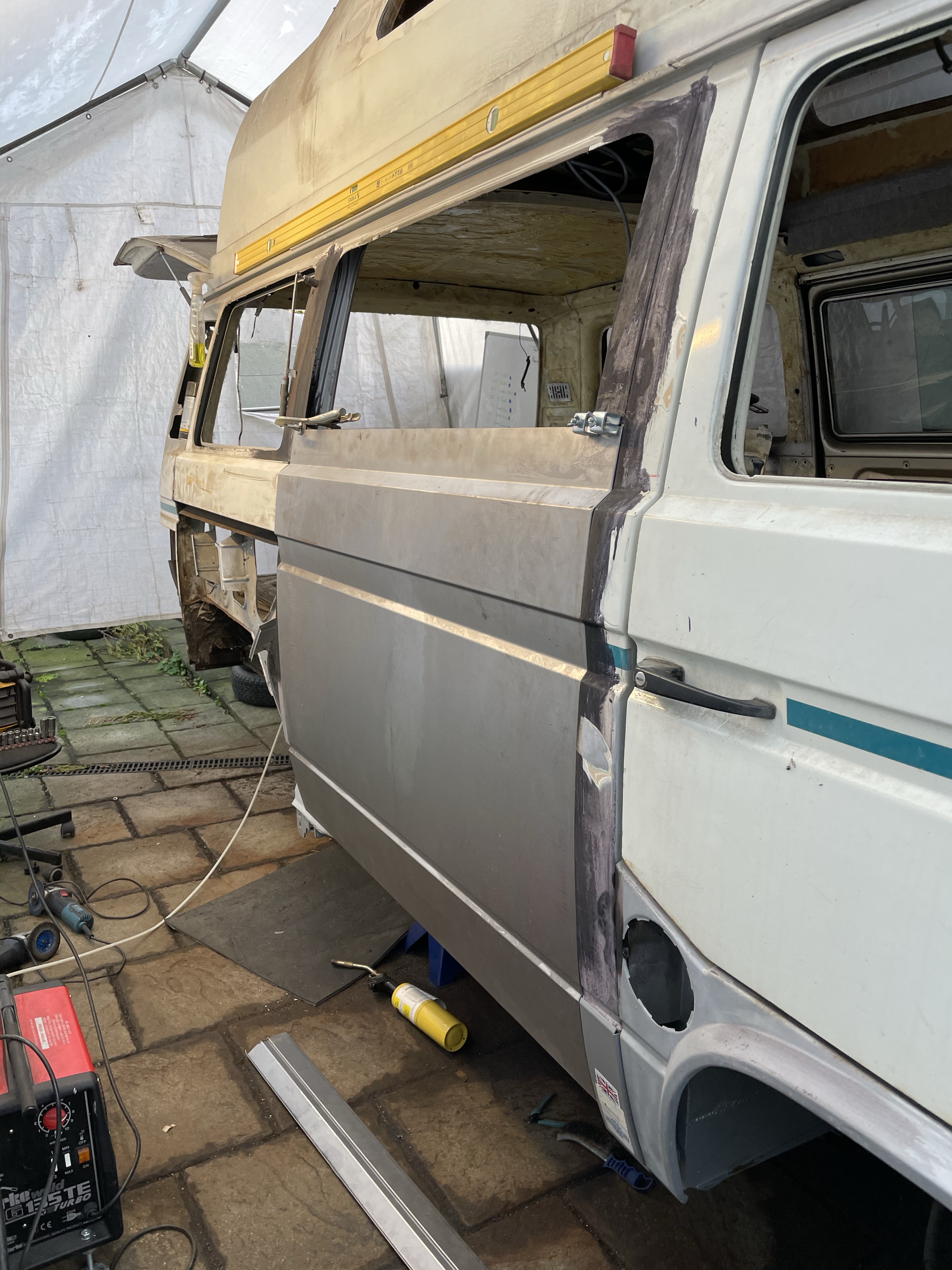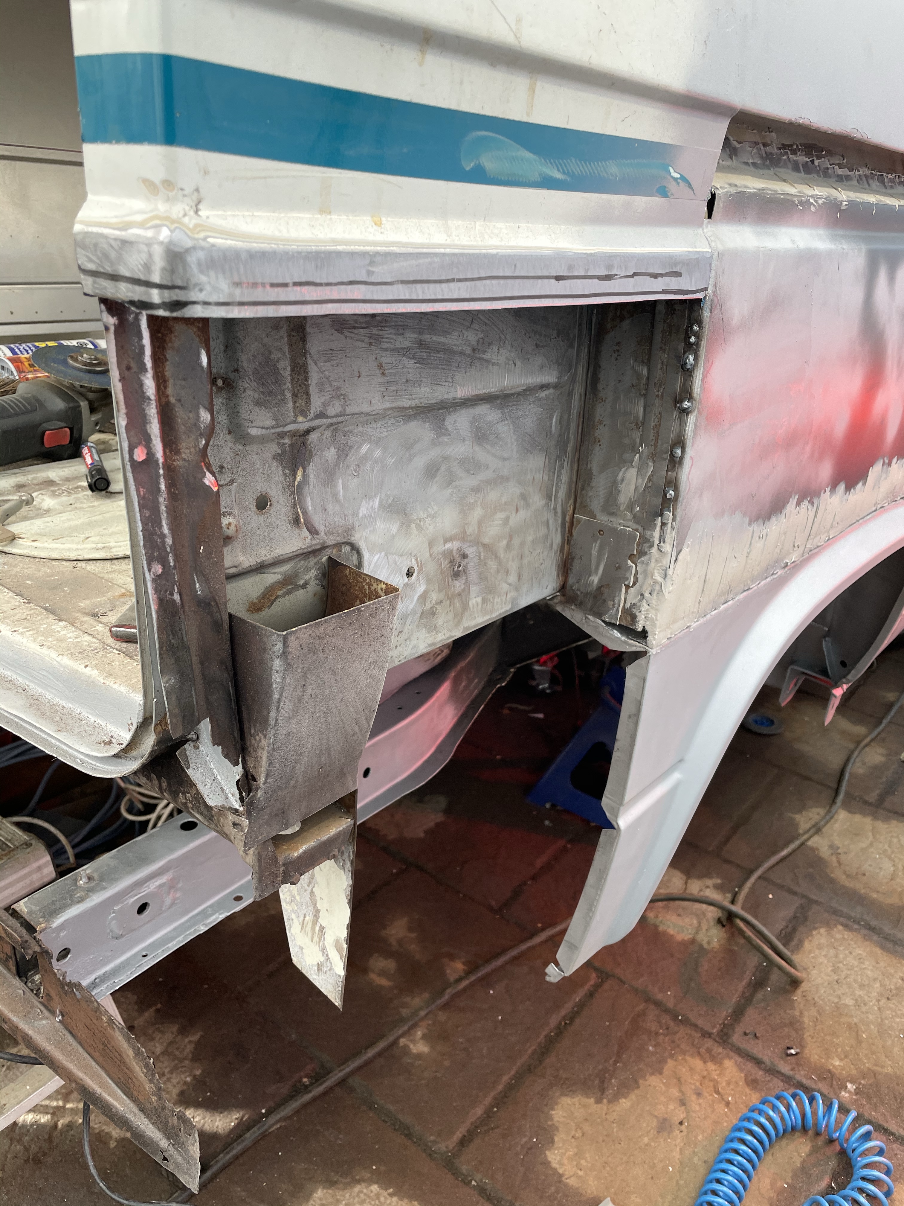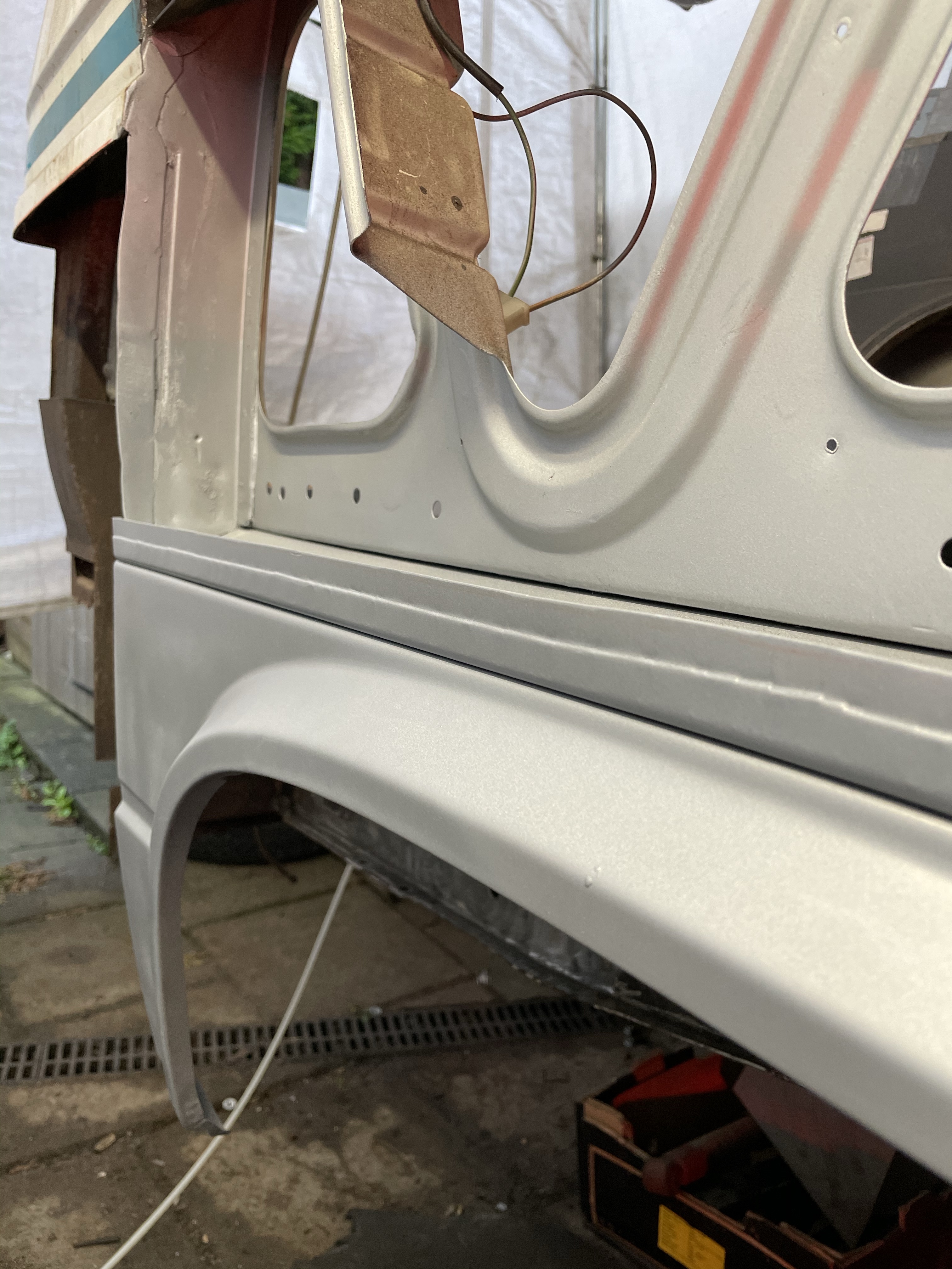 One of the first things that i noticed when i bought the van was the condition of the strut mounts on the tailgate, i could tell they were corroded but the way they are set in and the amount of filler and paint etc.. i wasn’t sure how much of it was rust / rot and how much was just the weird positioning of the brackets, so after stripping it all back and cutting out the rot i did a bit of research and lots of looking at other vans it was time i tackled mine, i found a few other suspect looking holes up towards the roof line that will get sanded back and inspected before i weld those up too. Tailgate is finally solid again in its opening and closing action and sits correct on the shut lines, also i am not worried it fall off when i open it anymore.