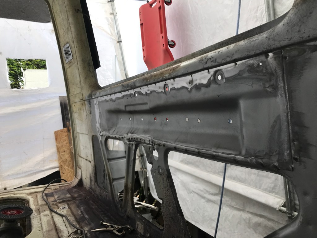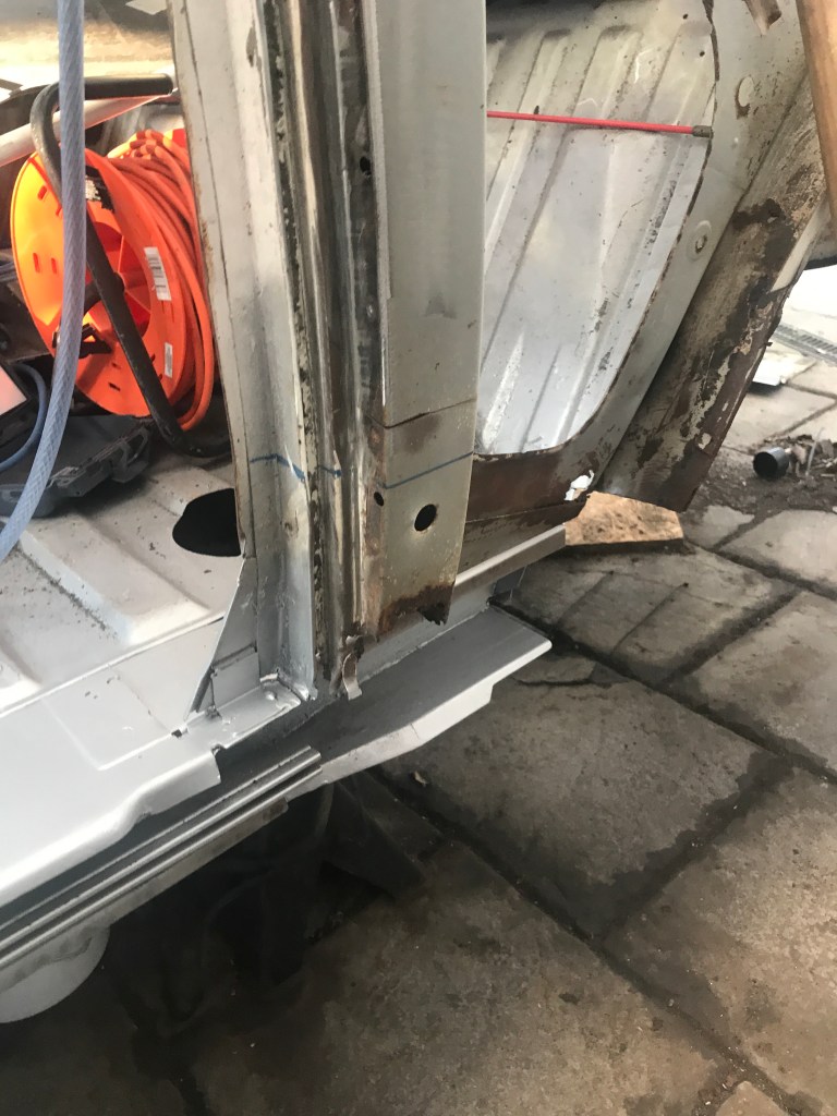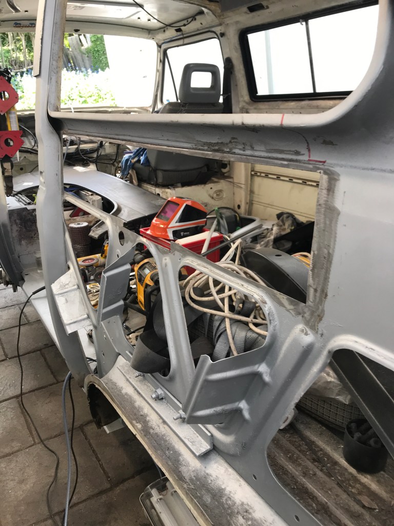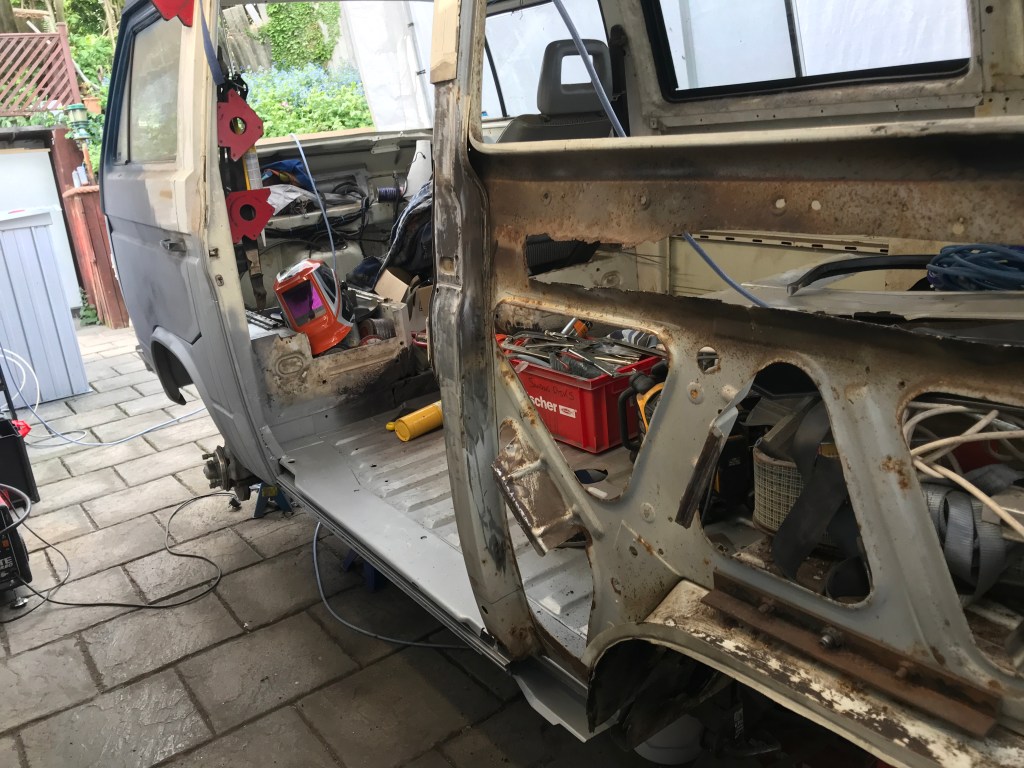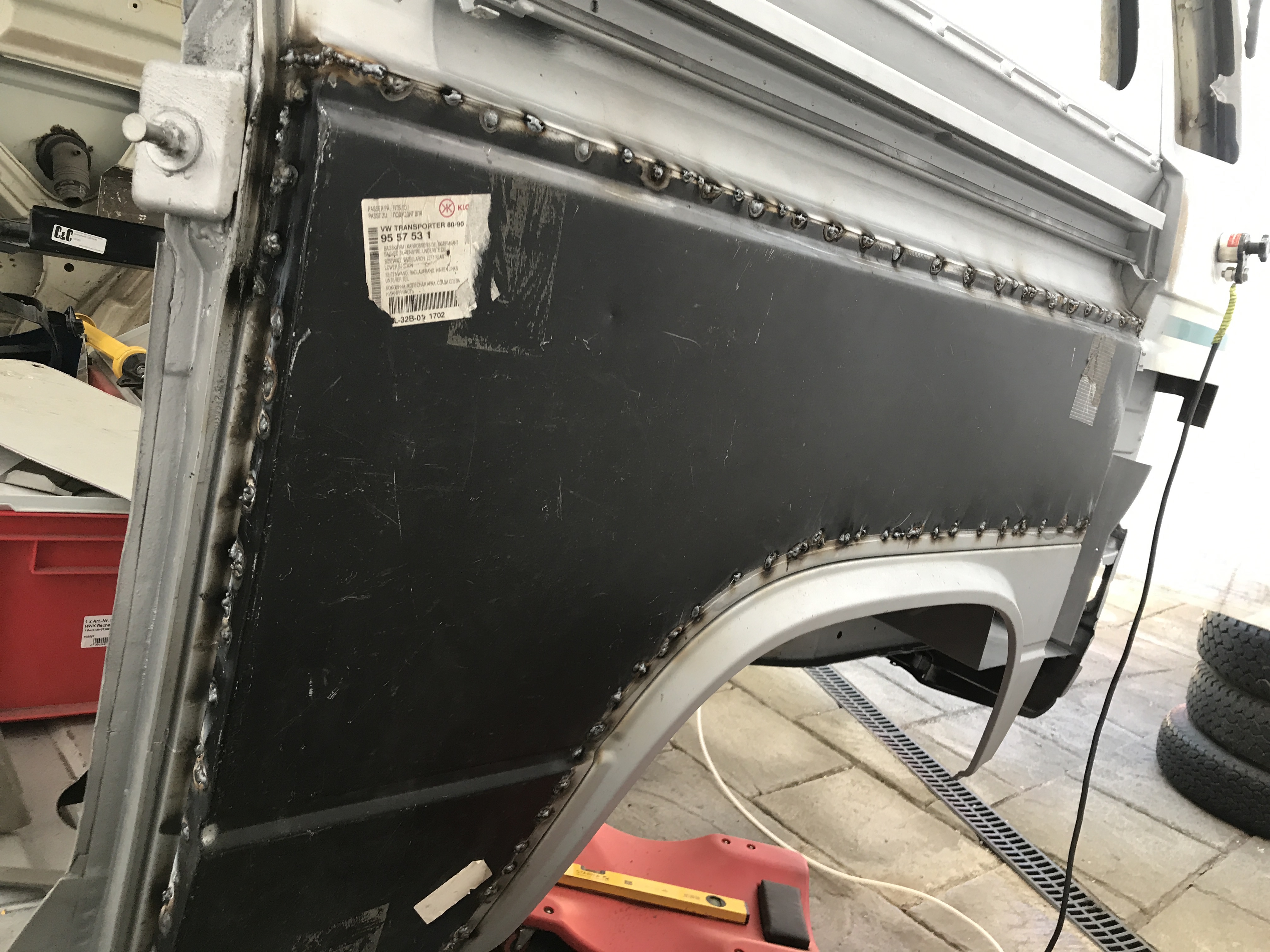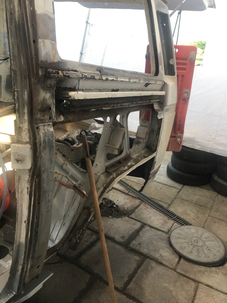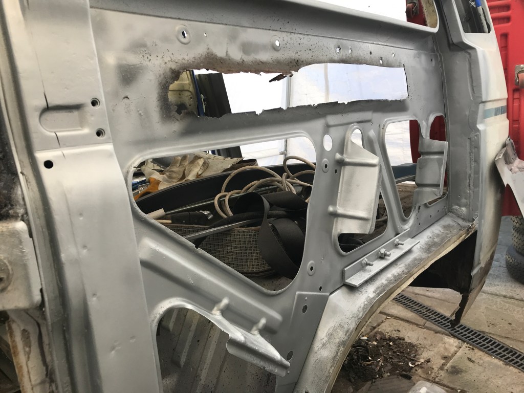 After cutting away the rust and rot it was easier to see what was needed to restore this particular area, lower C pillar was rotted away and although it will never be seen the structure was needed to fit other components to it so it had to be cut out and replaced, new panels were purchased and the job began, few fillet pieces cut and welded in and the structure started to take shape, when the basics were in place the rest kind of just slotted in around it. The arch was a bit more of a mess about, although you can buy a full arch it doesn’t come with the seams in place as per factory well at least not real seams anyway and although that may be a blessing when it comes to rust later down the line as seam rash is a big problem, i decided to try and make mine looking as per it left the factory with the correct seams etc.. that caused a few issues, number one is they don’t make a panel like that so i had to make my own out of a full panel and a rear quarter / arch off of a Doka style van, the end result even if it took ages and was way way more money than just a perfectly fine full arch was good and with a smudge of filler it looked factory correct. Cutting out the first of the rear swing arm mounts was very daunting, if the measurements were off the van could ride like a pig and tyre wear would be a massive issue not to mention it could potentially be drifting out of line a lot when driving, so after speaking to a couple of people and one restorer who actually does this for a living!!! the practiced method of lining them up through existing bolt holes in the inner area and brake line mounting points was used and as i checked the measurements i could get the mount within a tolerance of 1mm which i think will be absolutely fine, potentially if needed the swing arm / position can be adjusted when setting wheel alignment with the oval shaped bolt holes. time will tell on that part i suppose.