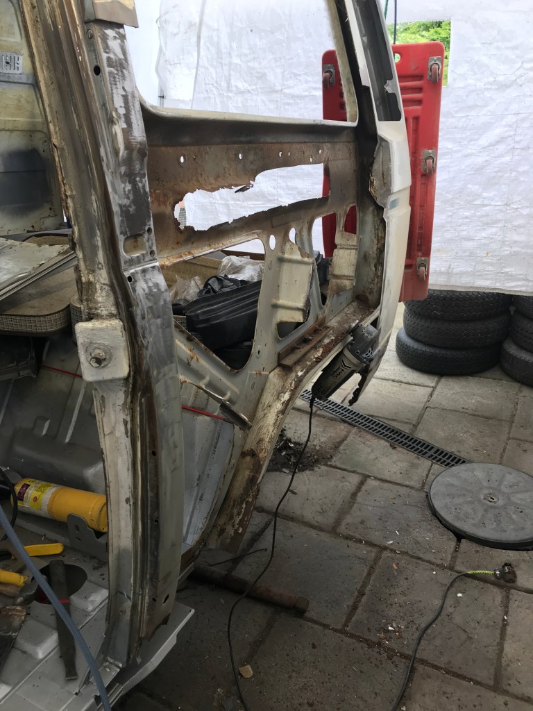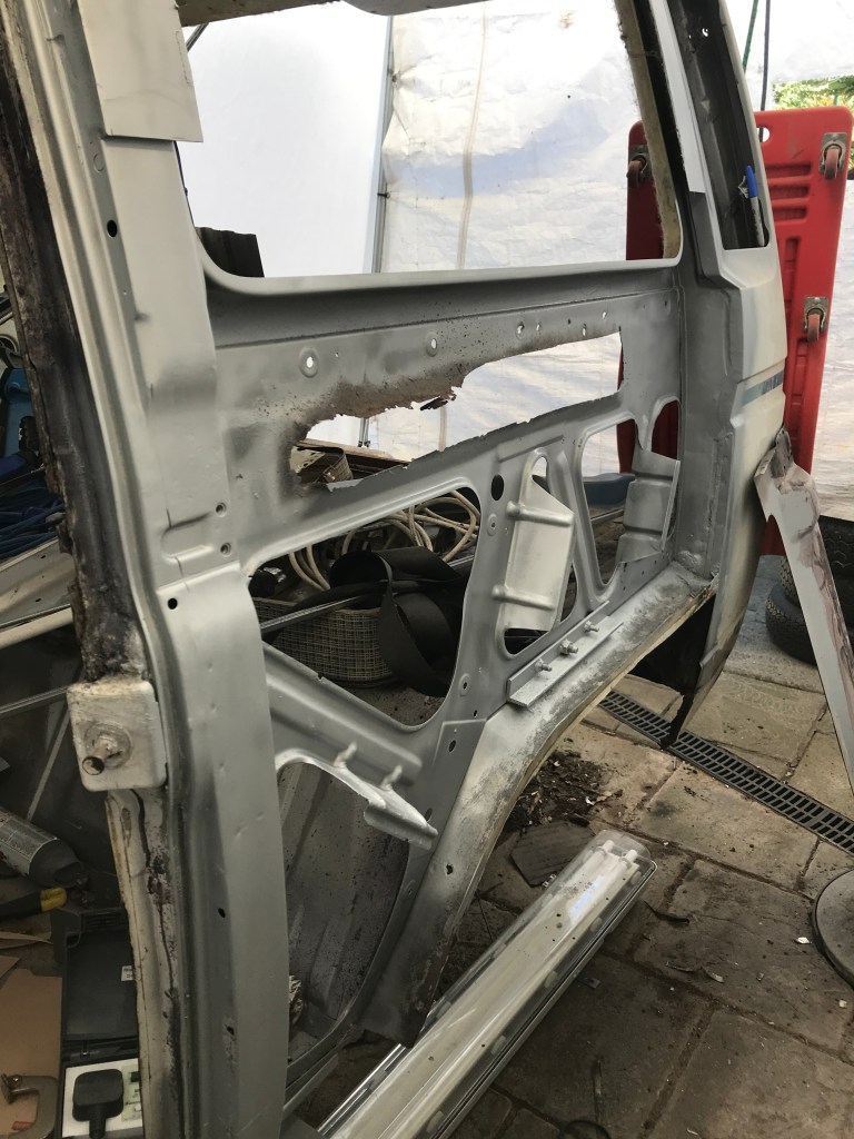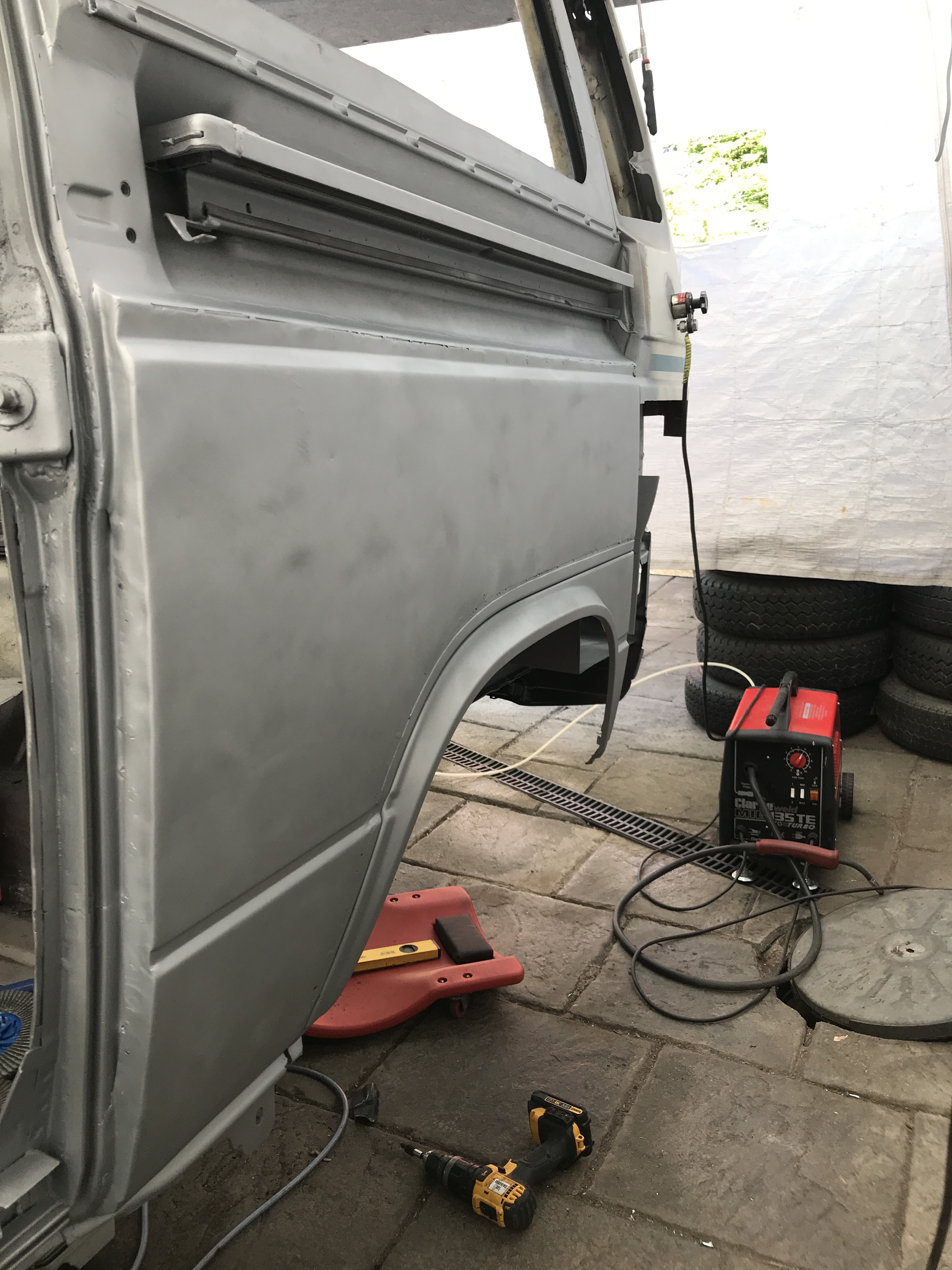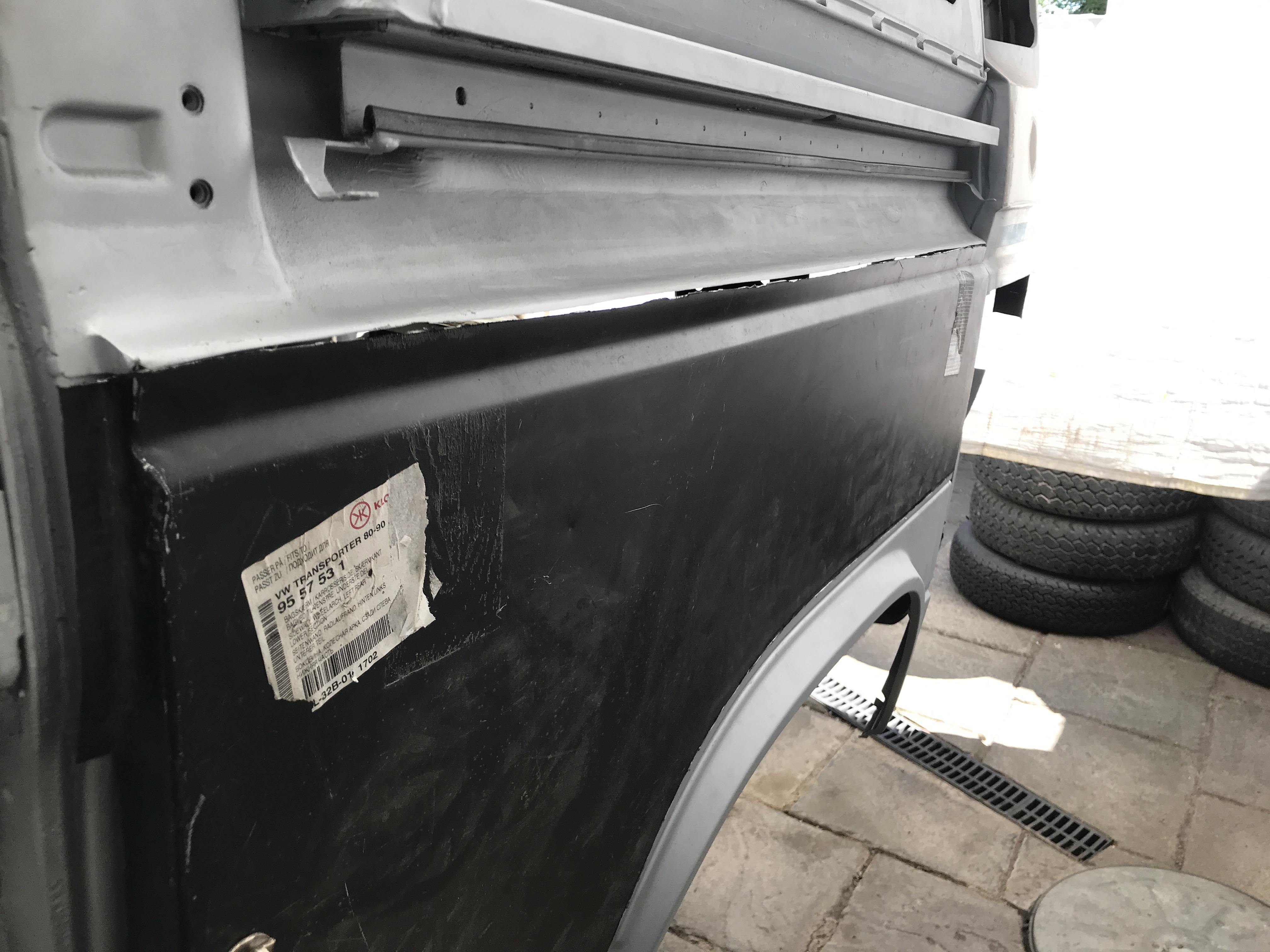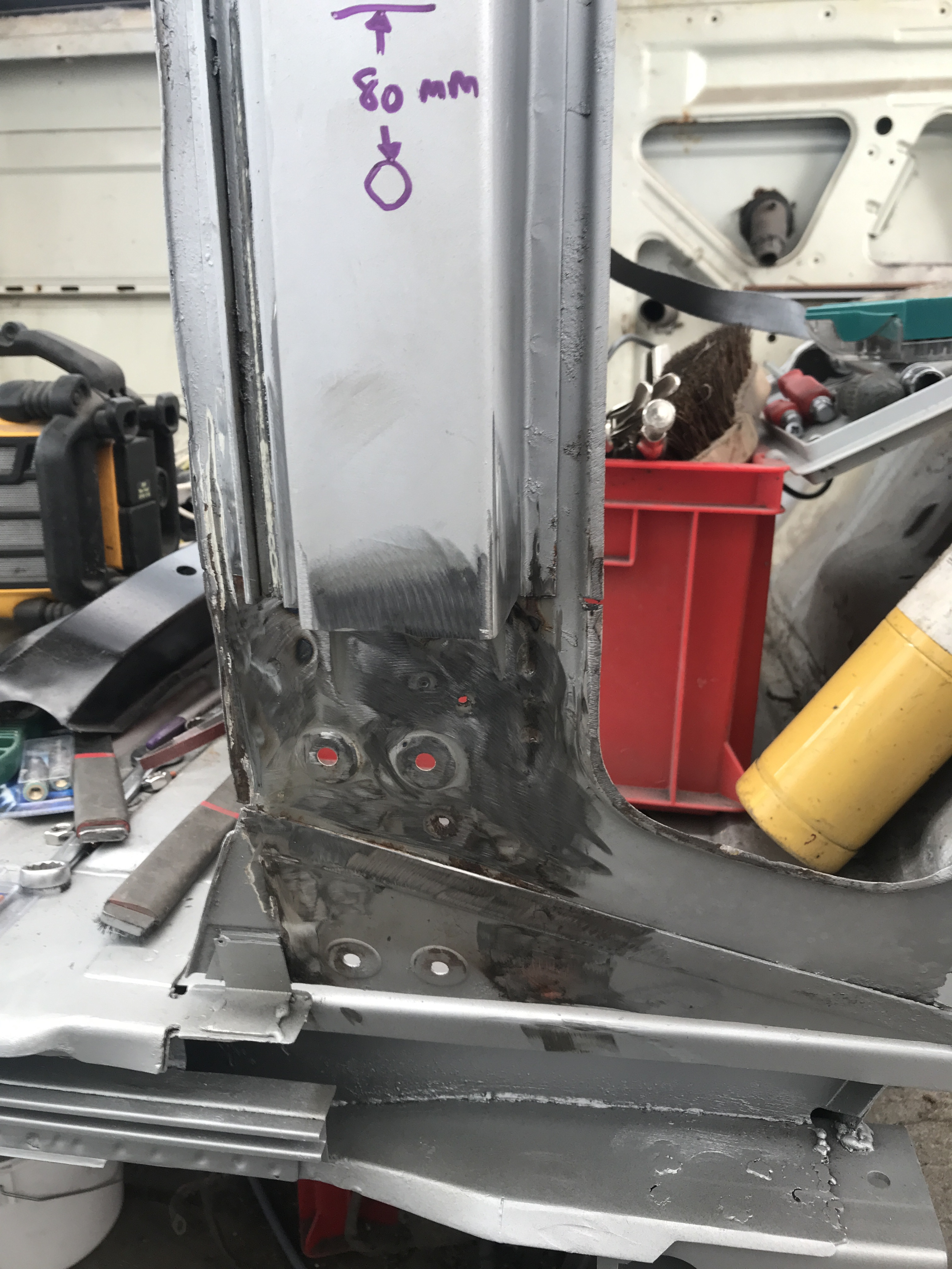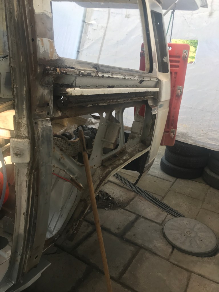 After cutting away the rust and rot it was easier to see what was needed to restore this particular area, lower C pillar was rotted away and although it will never be seen the structure was needed to fit other components to it so it had to be cut out and replaced, new panels were purchased and the job began, few fillet pieces cut and welded in and the structure started to take shape, when the basics were in place the rest kind of just slotted in around it. The arch was a bit more of a mess about, although you can buy a full arch it doesn’t come with the seams in place as per factory well at least not real seams anyway and although that may be a blessing when it comes to rust later down the line as seam rash is a big problem, i decided to try and make mine looking as per it left the factory with the correct seams etc.. that caused a few issues, number one is they don’t make a panel like that so i had to make my own out of a full panel and a rear quarter / arch off of a Doka style van, the end result even if it took ages and was way way more money than just a perfectly fine full arch was good and with a smudge of filler it looked factory correct. Cutting out the first of the rear swing arm mounts was very daunting, if the measurements were off the van could ride like a pig and tyre wear would be a massive issue not to mention it could potentially be drifting out of line a lot when driving, so after speaking to a couple of people and one restorer who actually does this for a living!!! the practiced method of lining them up through existing bolt holes in the inner area and brake line mounting points was used and as i checked the measurements i could get the mount within a tolerance of 1mm which i think will be absolutely fine, potentially if needed the swing arm / position can be adjusted when setting wheel alignment with the oval shaped bolt holes. time will tell on that part i suppose.