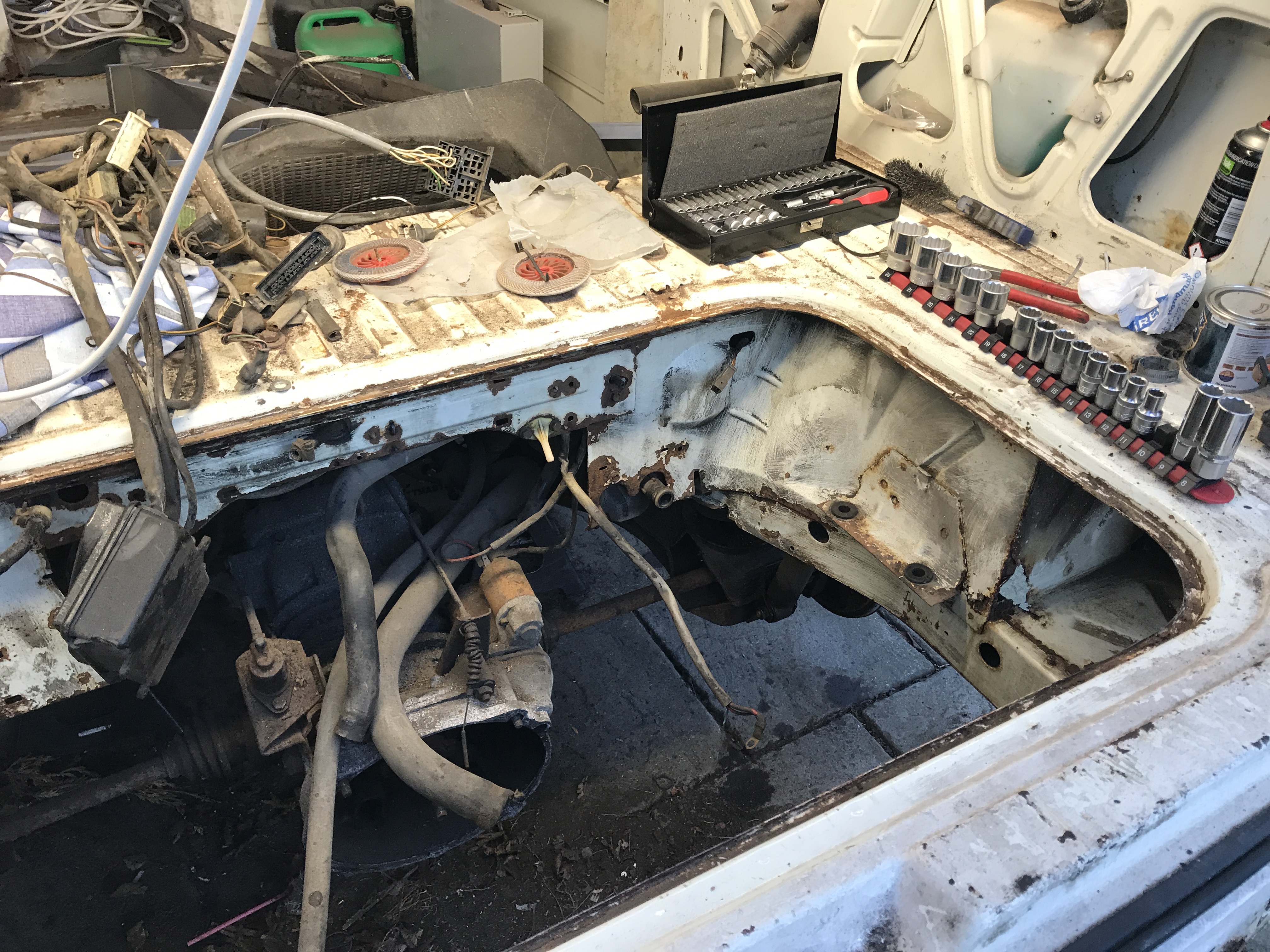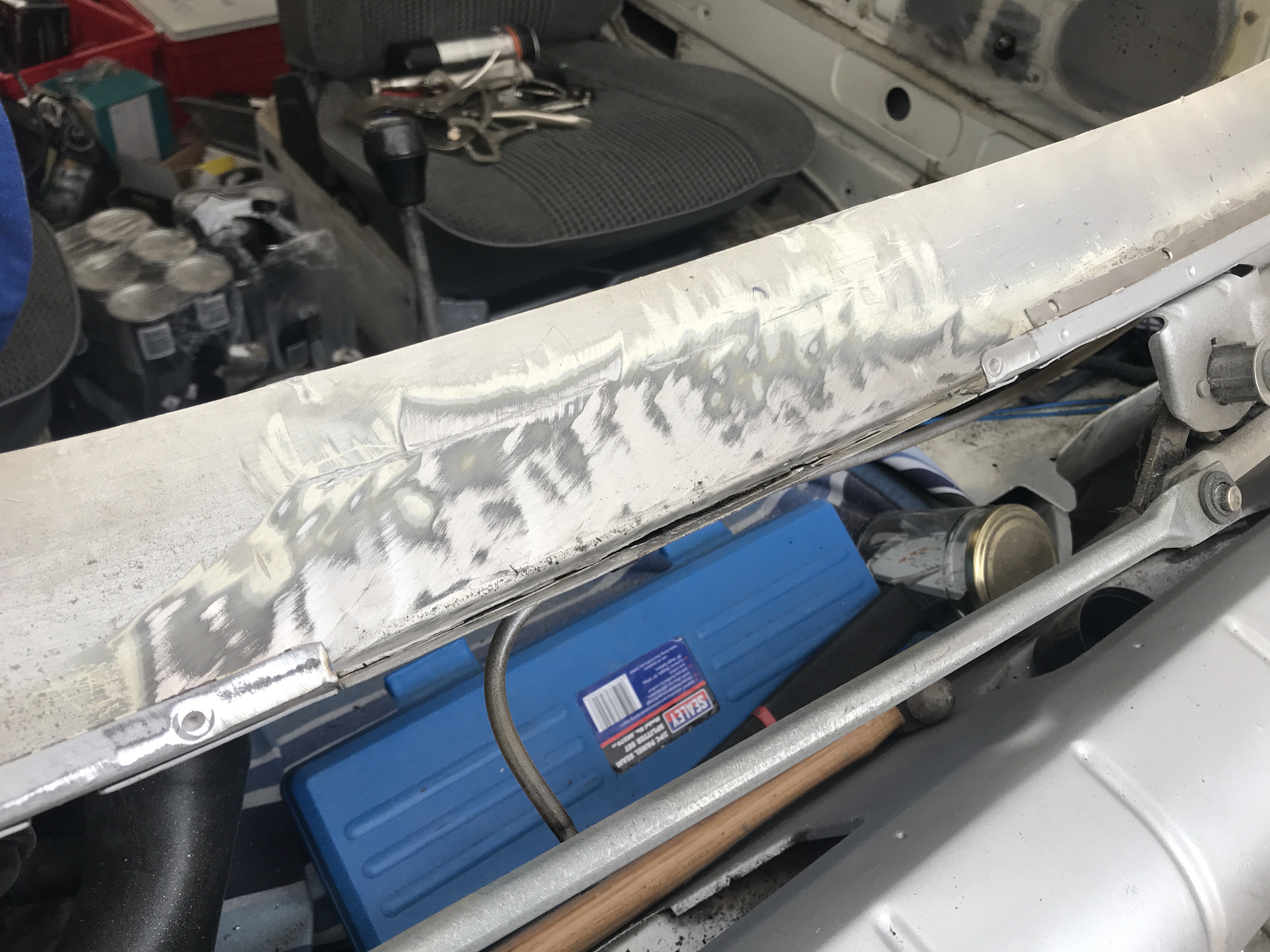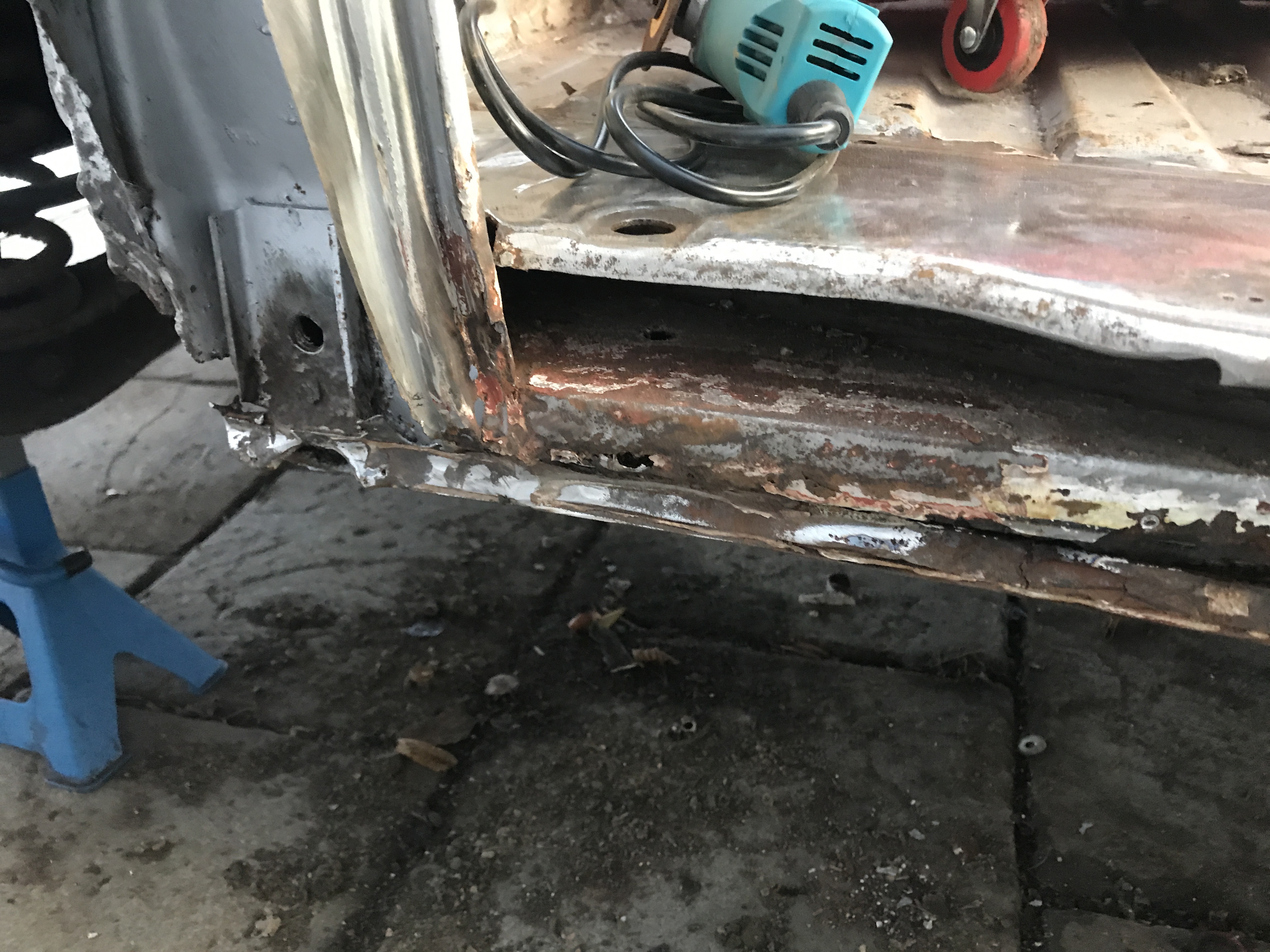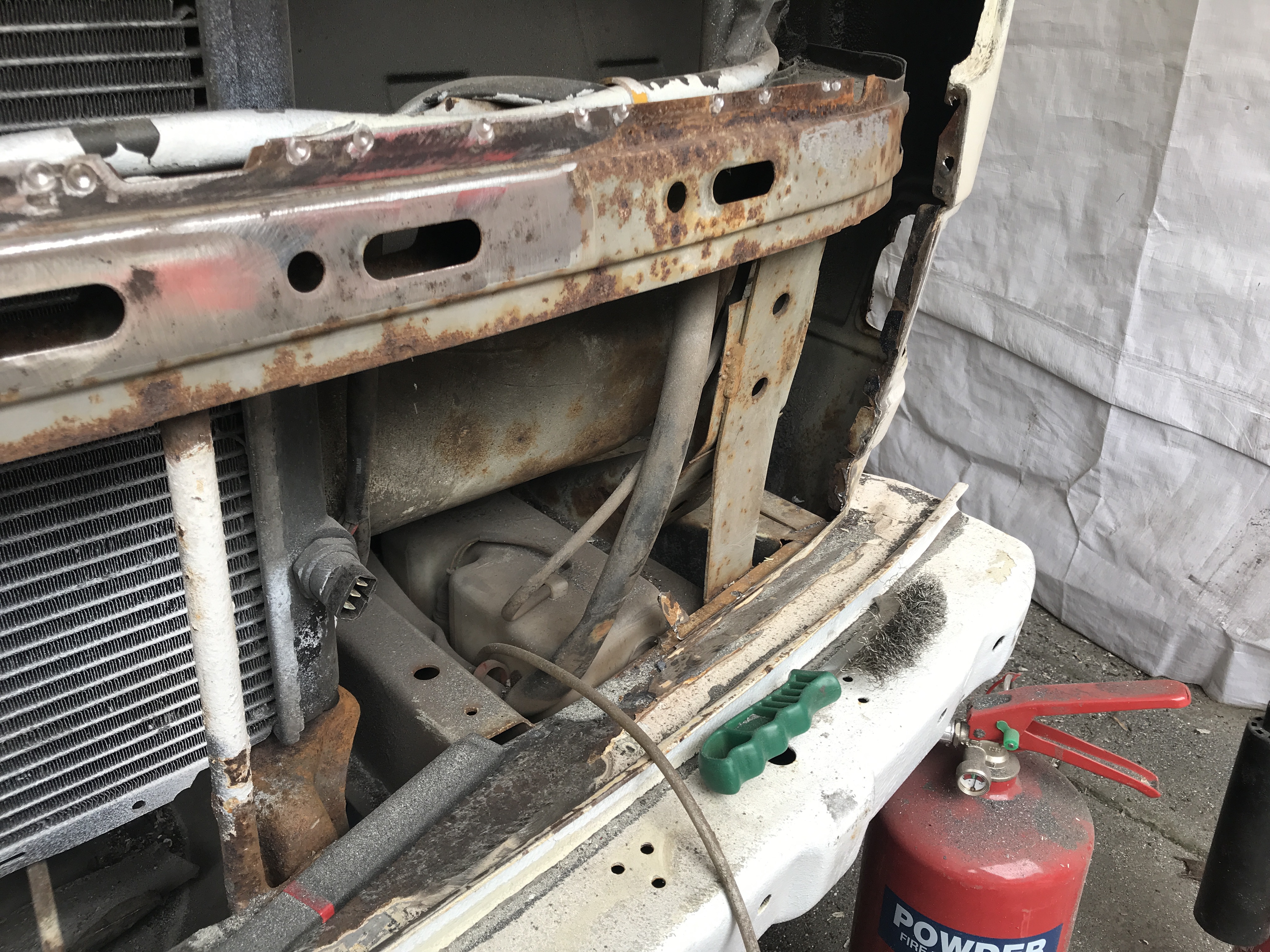 Time to start, after a bit of welding practice on some old scrap i decided to start off on the front end, strip it all down to good metal and see what’s going on underneath, cut away all the front upper and lower panels to reveal a lot of surface rust, a bit of rot which got cut out and what looked like a couple of panels to replace / weld back in, obviously this being all new to me i took my time and tried to at least think about it before rushing in, after cutting out the rot i treated the whole area with rust treatment and tacked in the upper panel, that went quite well after the windscreen repair (that was hard as my first proper welding experience) i left out the lower panel as the cab floors needed repairing and i thought it best to leave this area free to access it better later on…turned out to be a good idea as you will see later on.